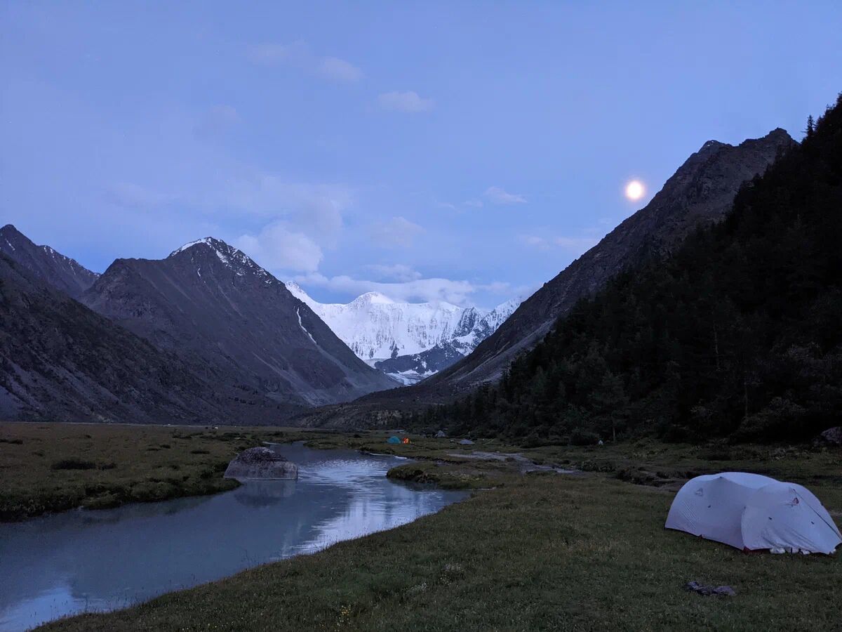 Ночами бывало холодно, у меня не было толком теплых вещей и спальник был летний, в ночь перед перевалом, я так замёрзла, думала умру от холода). Что нас не убивает делает сильнее! Это правда! Я очень рада что не сдрейфила, Рома и Сергей очень вдохновляют, хотелось побыть рядом с ними подольше. А вообще с погодой нам повезло! Когда мы поднялись на 3000 Белуха была нам открыта!