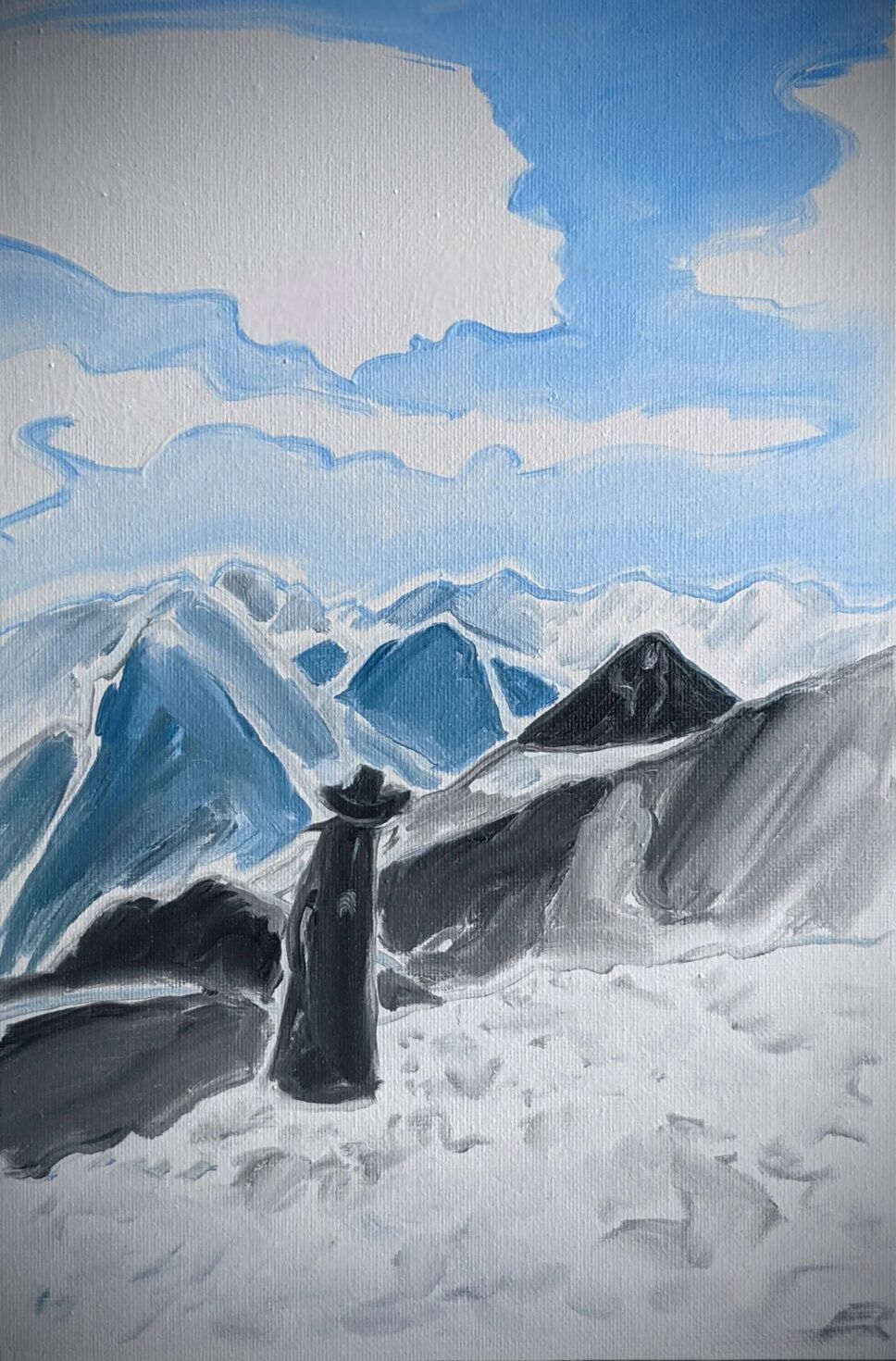 Мое внимание привлекла черная гора перед Белухой, я ее назвала богиня Кали, увидела в ней женский образ в черном одеянии, который говорит и приглашает. А у Белухи увидела образ Альпиниста. Я читала и правда альпинисты покоряют эту вершину)